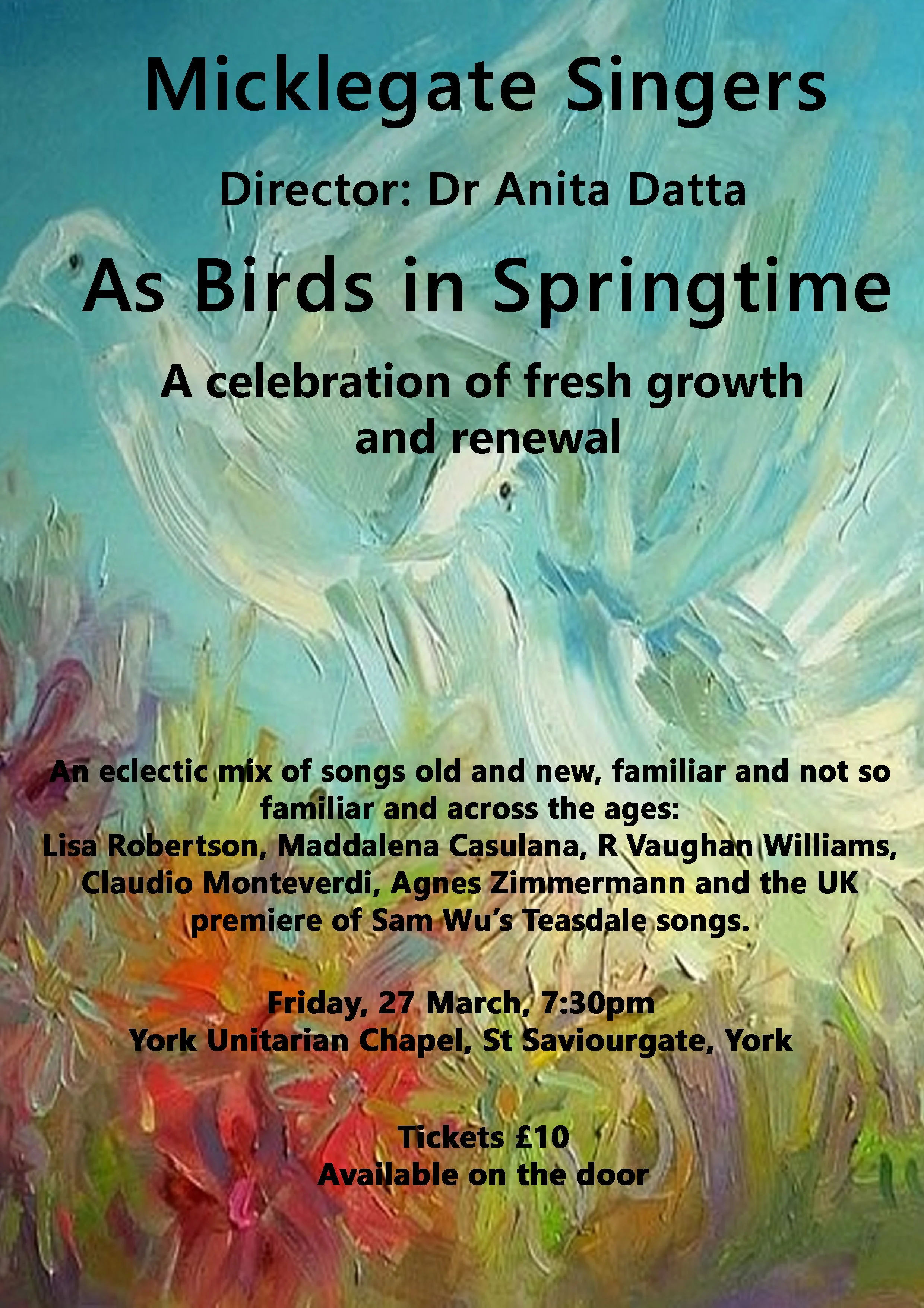 In her first concert as Musical Director of the Micklegate Singers, Dr Anita Datta presents an exciting Mickle-mix of old and new works, celebrating the fresh growth and renewal of springtime.
